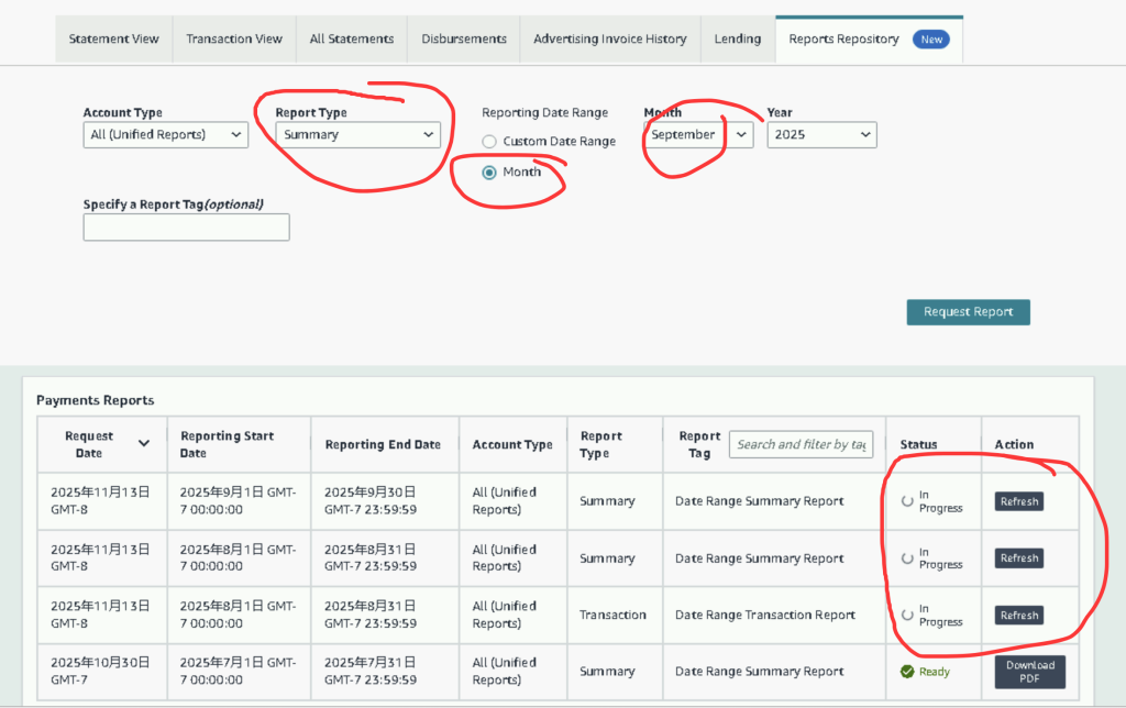 如下图选择后,点击 Request Report, 然后列表中会出现Status为“In Progress”的显示。过几分钟后,点击旁边的”Refresh”按钮,如果Status变成”Ready“,则可以点击旁边的 “Download PDF” 下载汇总报告。