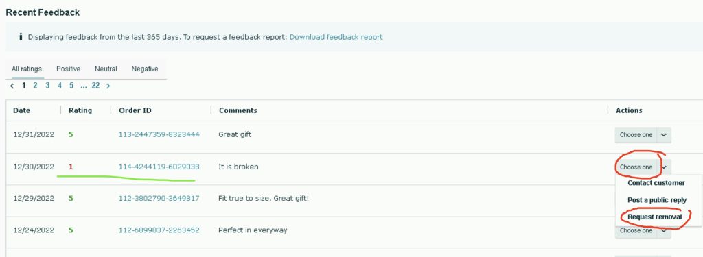找到差评的订单,点击右边的 Actions: 选择 Request removal, 如下图所示: